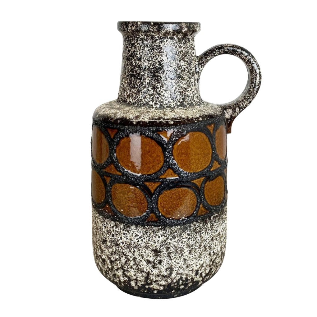 The jug has a sturdy handle and a balanced, sculptural shape that works beautifully as a decorative vase or display piece. Natural variations in the glaze and surface wear are present, adding to its authentic vintage appeal.