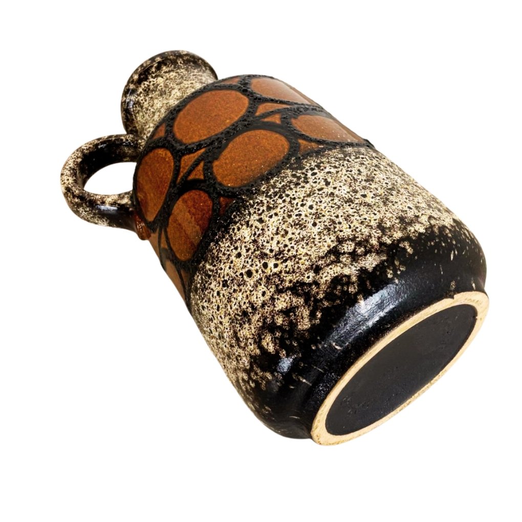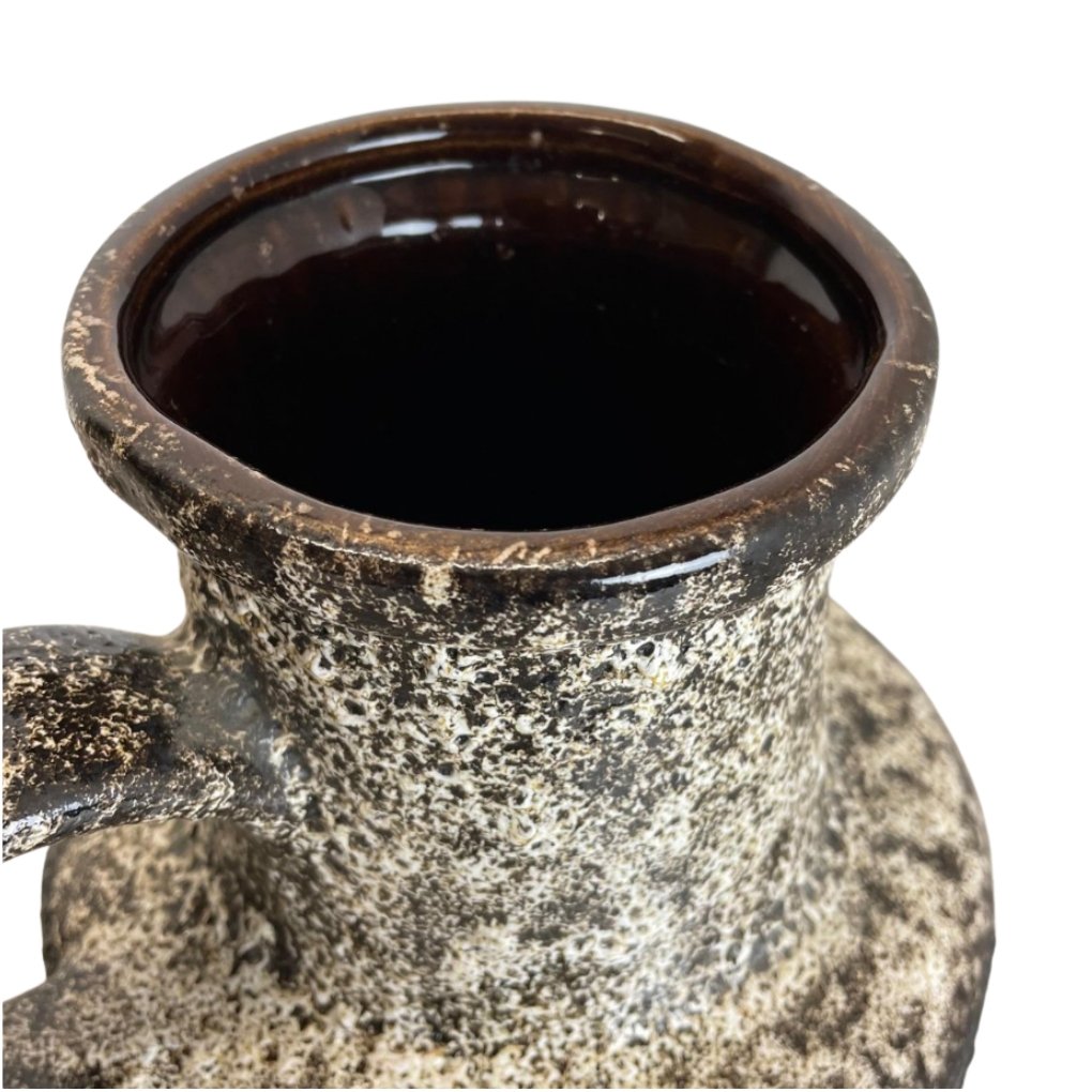 This is a pre-owned vintage ceramic jug featuring a distinctive textured glaze and a decorative geometric band around the body. The contrast between the speckled surface and warm brown detailing gives it a strong mid-century character.